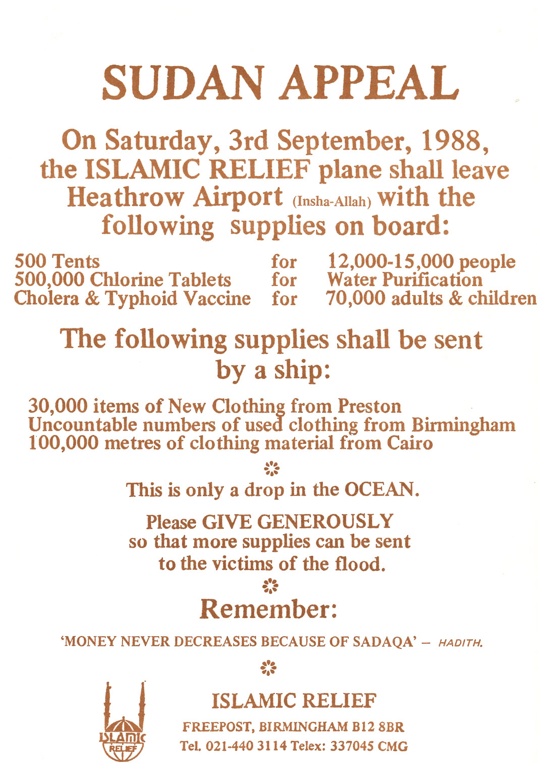 Determined to help people in Sudan who had fled famine in neighbouring Ethiopia and what is now Eritrea, a group of medical doctors and activists set up the charity which will become Islamic Relief Worldwide. A 9-year old boy in Cairo, Egypt, gives his 20p pocket money – his generosity making him our first ever donor. From such small acts of kindness, enormous impact will grow as volunteers begin fundraising in mosques in Birmingham, UK.