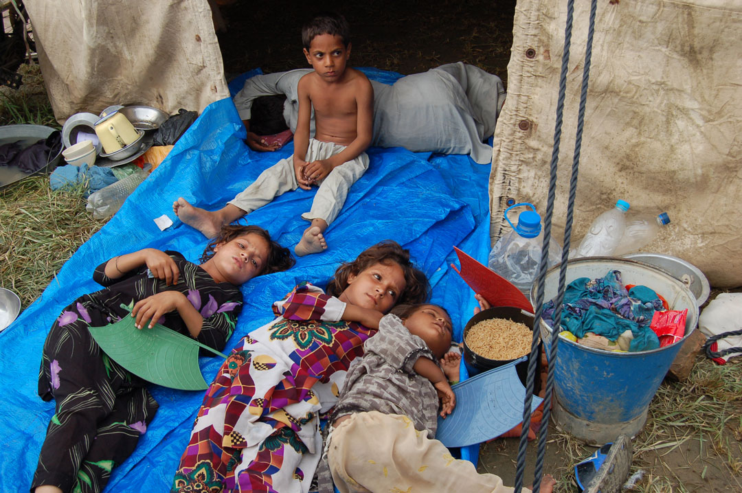 Children shelter in a tent as Pakistan experiences the worst floods in living memory. Islamic Relief responds with a major relief and reconstruction operation serving 428,000 people in over 580 villages