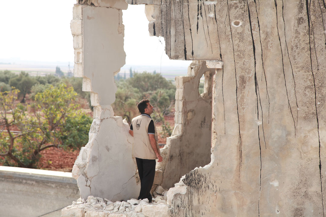 An Islamic Relief aid worker examines a damaged building deep inside Syria
