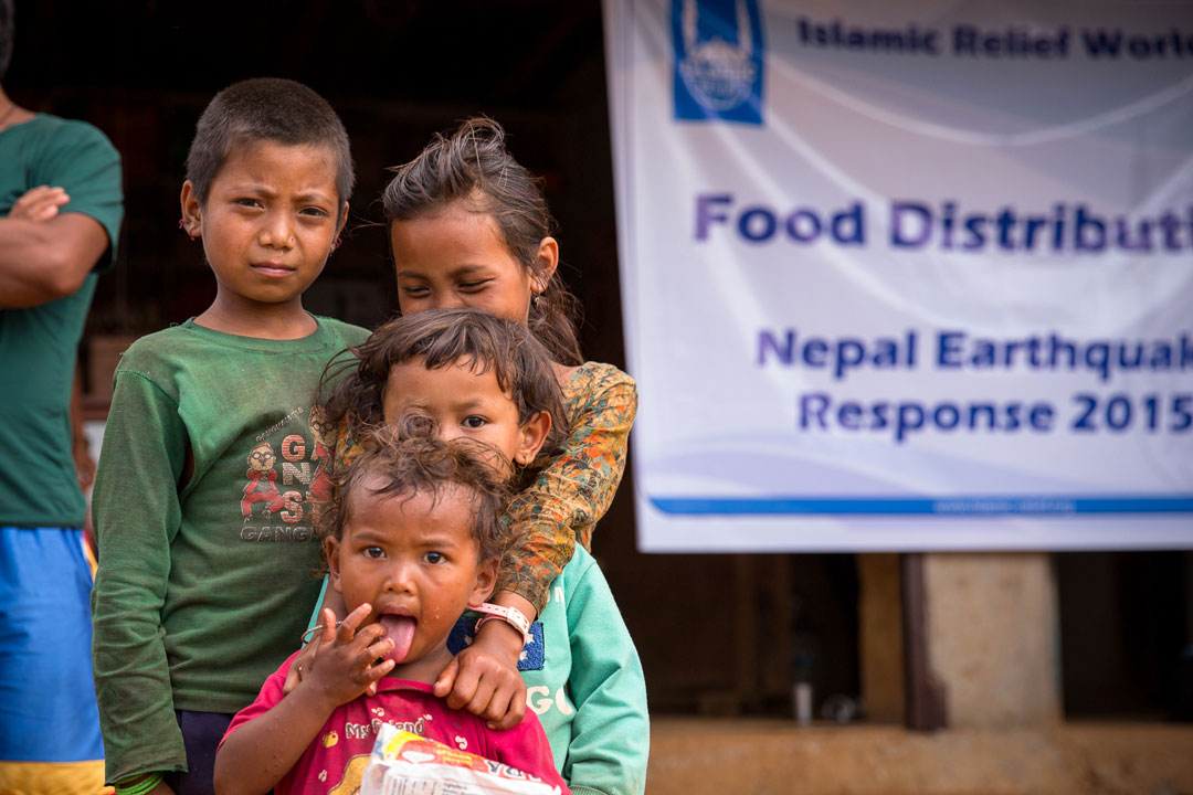 Children in Nepal wait to receive food from Islamic Relief in the aftermath of an enormous earthquake